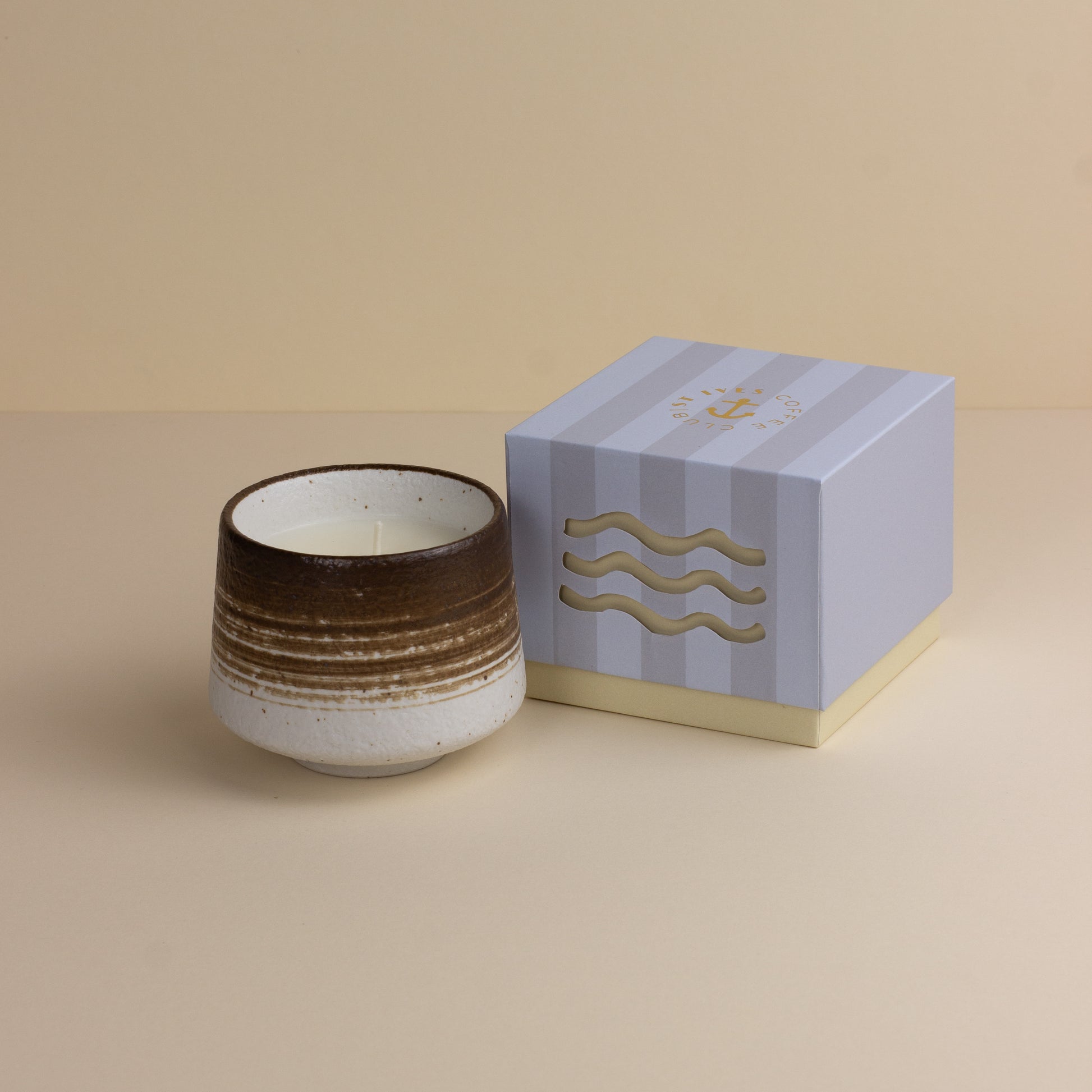 Introducing the exquisite St Ives: Praa Sands Candle, inspired by the majestic cliff formations of Cornwall, England. This candle comes in a matte, textured, white vessel with added horizontal brown stripes.